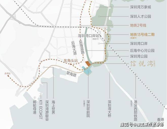 公共交通方面,项目距地铁2号线东角头站约363米,步行5分钟即可抵达;在建的13号线歌剧院站通车后,可快速直达南山科技园、后海总部基地等核心产业区;1公里范围内拥有18个公交站点,M493等多条公交线路覆盖,日常出行便捷高效。自驾出行可通过望海路、后海滨路快速通达深圳湾口岸、前海合作区,跨境通勤与全城出行均无压力。