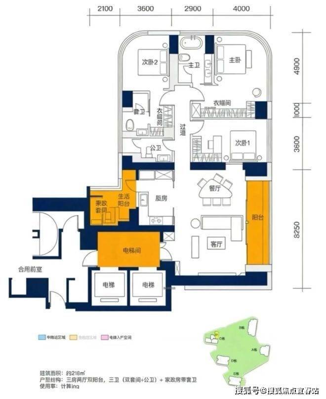 分布于D座和E座,3梯2户设计,专梯入户保障私密性。户型采用弓形结构,家政套间与采光面设计为亮点,270°环幕景观阳台可最大化享受海景视野(20层以上视野更佳)。作为项目首推户型,该户型性价比突出,总价约5000万内,在同价位段具备较强的市场竞争力,适合追求空间舒适度与景观体验的高净值家庭。