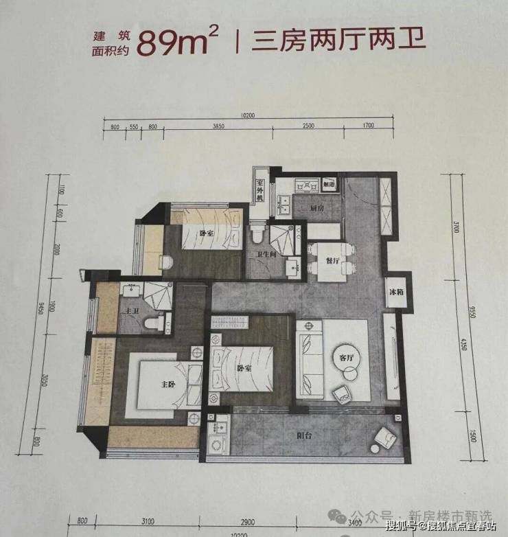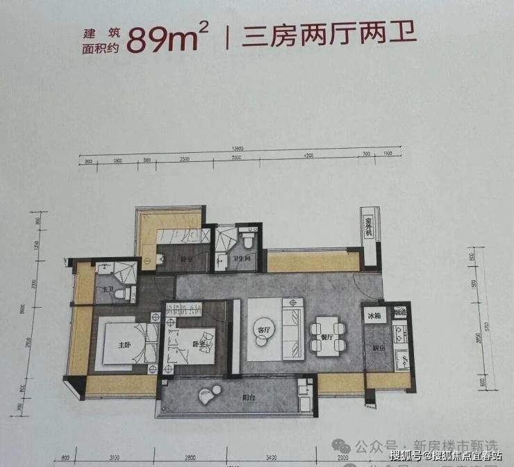 建筑面积约89㎡户型-3房2卫(竖厅)
