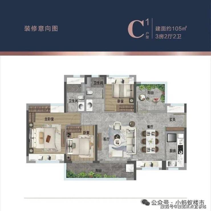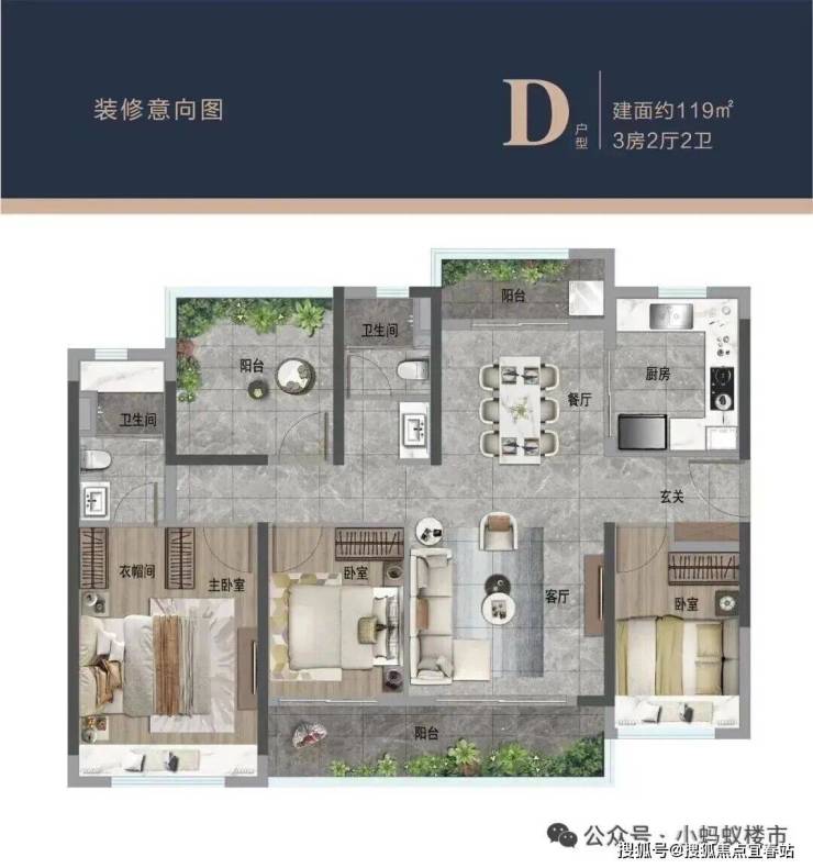 · 119㎡ 3+1房两厅两卫:MAX级超阔尺度观景阳台,强调尺度感,适合追求品质生活的人群