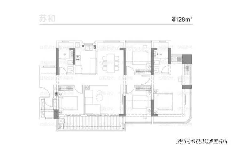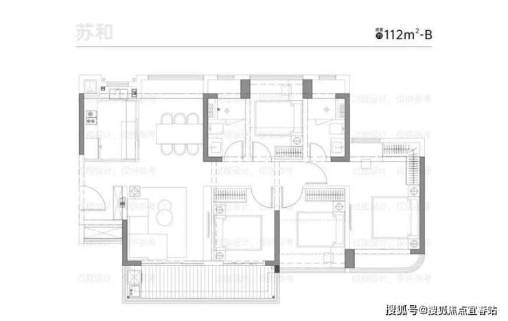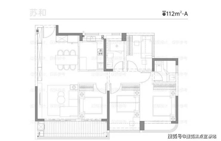 约112平的四房A户型,整体格局有点像约87平户型的放大版。