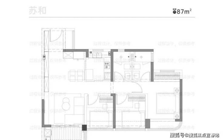 进门直接面向餐厅和厨房,私密性略打折扣,但后期可用软装调整,厨房为推拉门设计,有中岛,餐厨空间相对开阔。