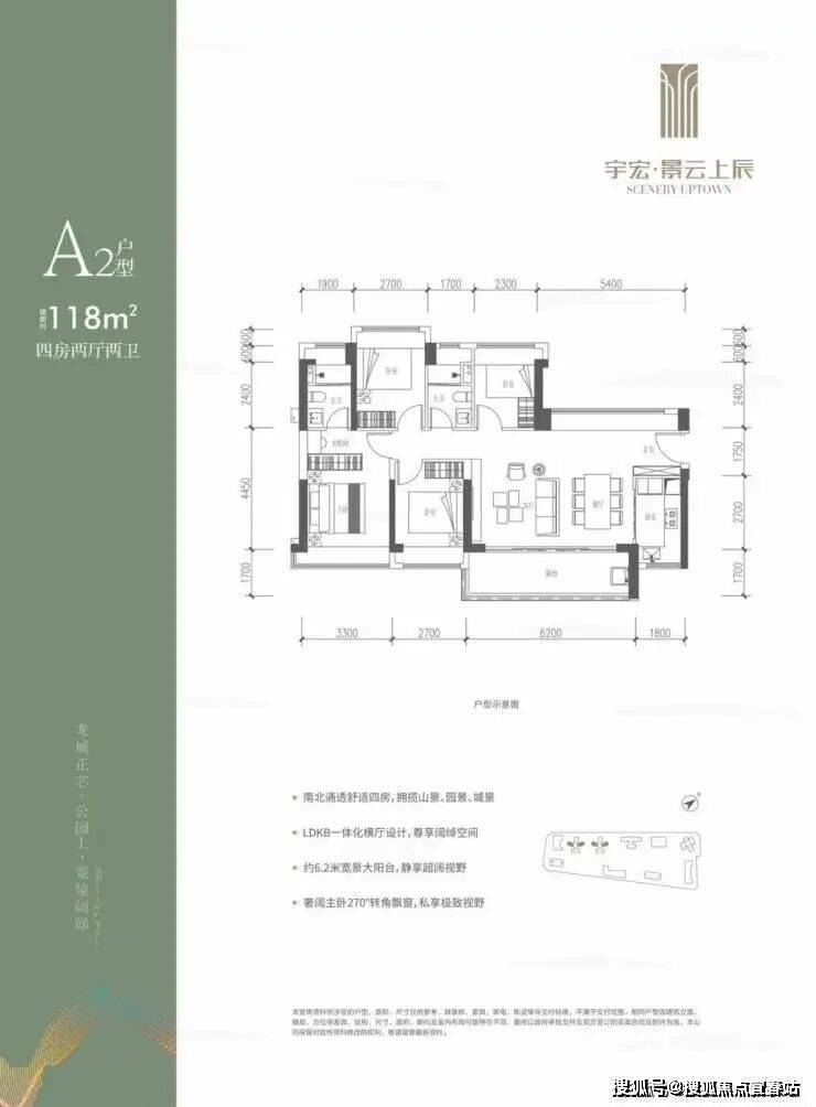 118㎡4房2厅2卫,横厅南北通透格局,入户玄关和5.4米大飘窗,U型厨房,6.2米景观大阳台,客厅面宽6.2米,主卧室套房设计有独立卫浴南北通透,4个卧室面宽分别在3.3/2.7/2.7/2.3米。
