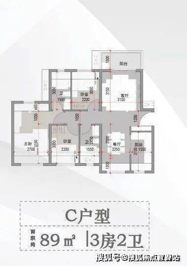 C户型 面积约89平方米 3房2卫🌴中山▪万科深业湾中新城|品质人居优选🌊