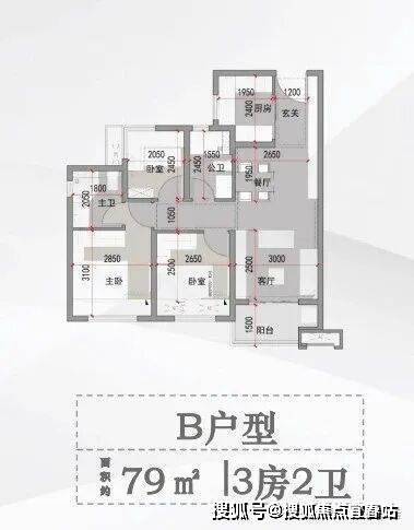 B户型 面积约79平方米 3房2卫