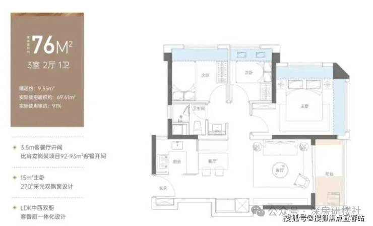 79㎡三房一卫,三房间向阳,开间3.3米,总价206万起 阳台朝西【20套,楼层可选】