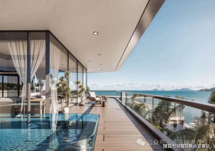 建筑以“超流体立面”呼应海浪肌理,通过悬挑阳台、底层架空消解建筑与水岸的边界,搭配 270° 观景阳台、云端泳池、环形瞰海露台等设计,让河景、海景与生活空间深度交融,成就“外揽海之豪迈,内藏河之幽静”的谧境岛居。