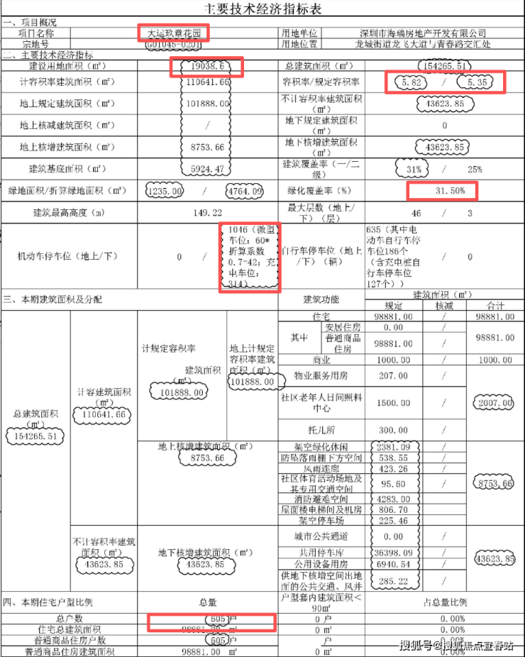 项目总占地面积约2.08万㎡,总建筑面积约15.66万㎡,计容建筑面积约11.3万㎡,容积率5.43,绿化率31.5%,共由5栋总高31-46层的住宅组成,其中1/2/4栋住宅46F,3栋A座住宅43F,3栋B座住宅31F,5栋是1所幼儿园,配建有托儿所,社区老年人日间照料中心。总规划605户,全部都是商品房,其中3栋B座2梯4户,3栋A座跟4栋是3梯4户,1/2栋3梯2户设计,地下室有3层,总规划车位1064个,其中带充电桩车位314个,车位占比达到了1:1.73。