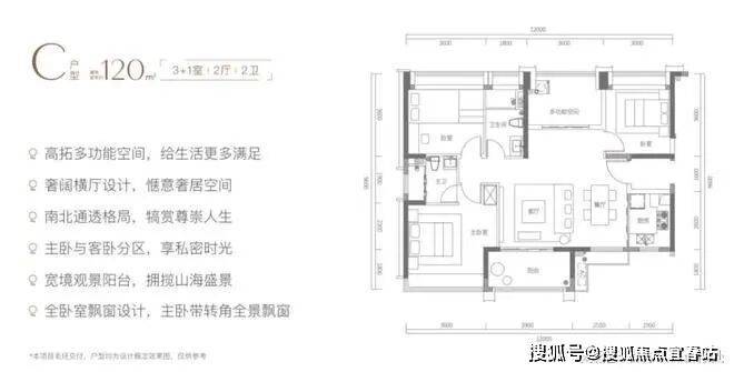 C户型高拓多功能空间,户型方正,格局南北通透,采用开间约7m的奢阔横厅设计,南北两侧宽境双阳台设计,将海景、山景拉满客厅、餐厅,映入整个室内功能区。