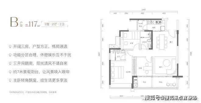 B户型为开阔三房设计,户型方正、格局通透,空间舒展,功能分区科学合理。客厅连接宽约7m的宽幅景观阳台,南向可望蔚蓝大海与晴空万里,景观面极佳