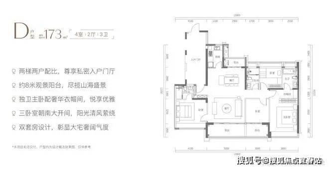 D户型为尊贵四房三卫设计,三卧室南向海景大开间,采用双套房配备私属卫浴设计,主卧配备专属奢华衣帽间,居住体验更为奢华。