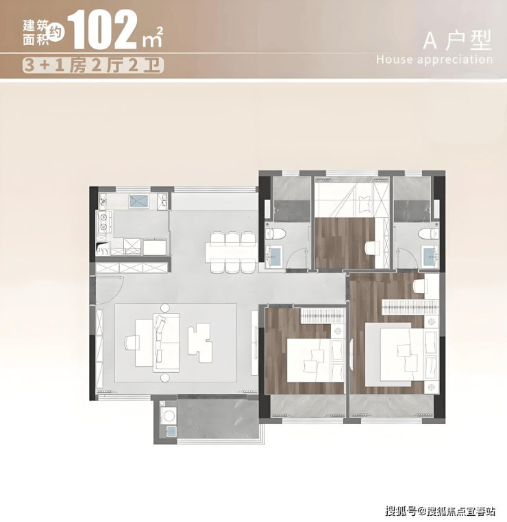 譬如建面约102㎡户型,有3+1房、4房两种交付选择,契合不同家庭居住需求。