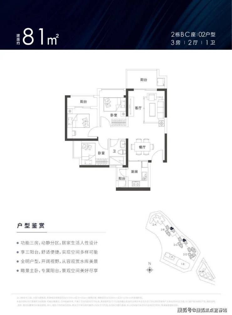 建面约79-129㎡3-4房户型,南北通透,3房3.5~3.7m,4房3.8~4.2m,罕见阔绰开间,客厅、厨房、卧室三阳台多飘窗,超高使用率。