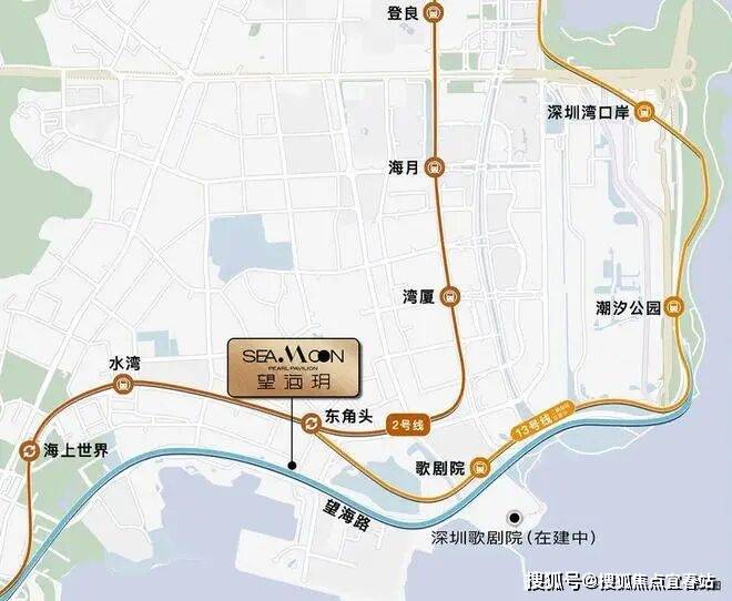 望海玥项目具体位于望海路和湾厦路交汇处,蓝漪花园以东、蛇口老街以南,毗邻蛇口广场,与地铁2号线及13号线(建设中)东角头站相距约200米。