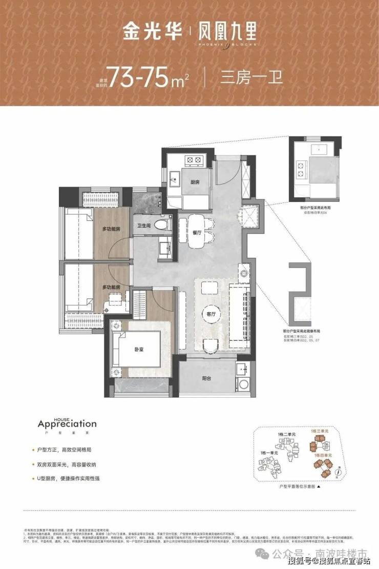 在售户型三:73-74平米三房一卫:总价区间在240-270万左右