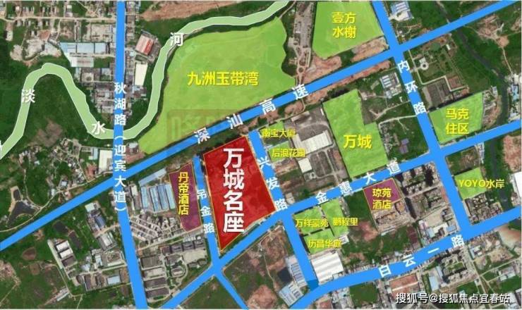 万城名座位于惠阳区淡水街道白云新城片区,西邻深圳龙岗中心城,距深圳龙岗行政界线约2公里;项目南北各紧邻一条交通主动脉,其中北侧为深汕高速,目前最近出口为车程5.7公里的淡水出口,而已确定规划的另一个出口——白云新城出口距离约500米;项目南侧紧邻的则是惠阳核心城区东西主干道之一——金惠大道,再往南则为另一条惠阳东西主动脉白云路。项目东西两侧则分别是兴发路和吊金路
