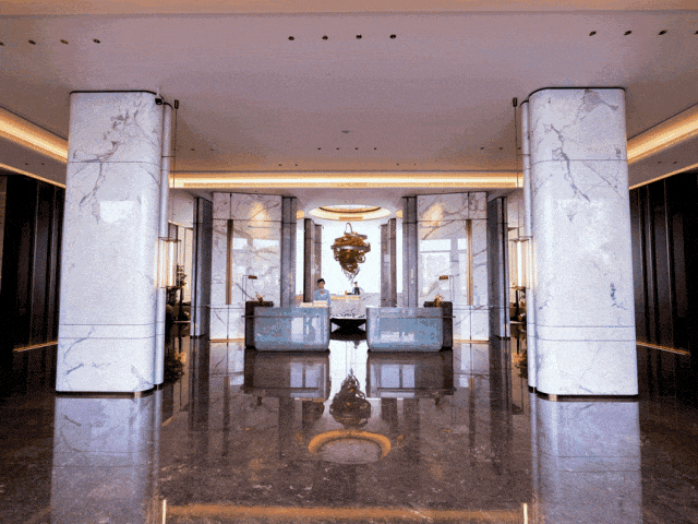 双服务前台,同样以意大利进口的亚马逊蓝大理石打造;光是这,就已足足有三种天然奢石,足见项目的舍得。