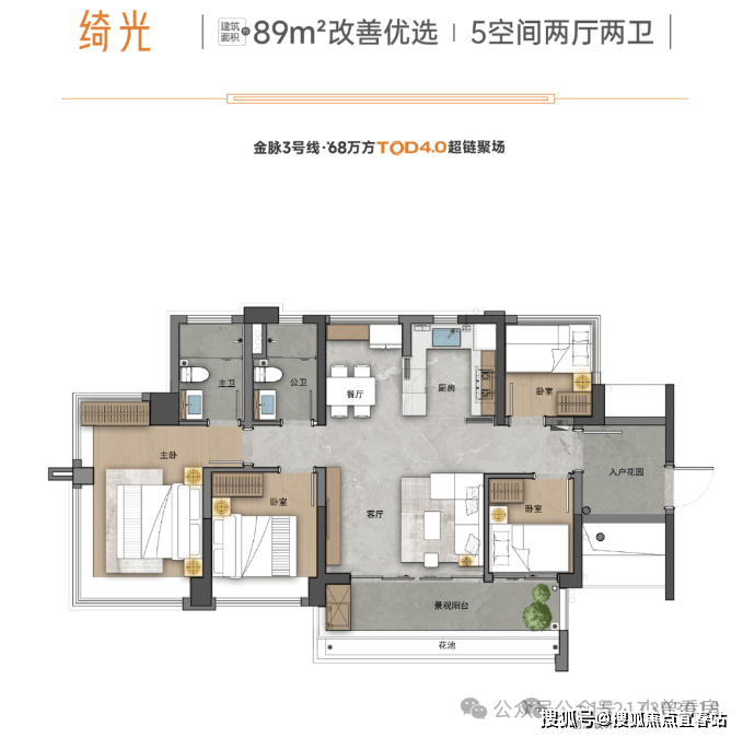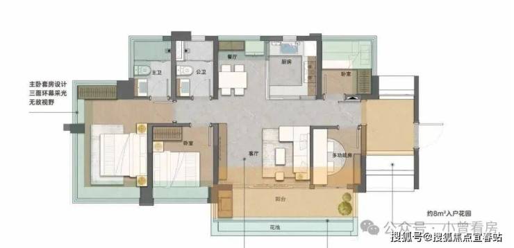 建面89平四房,该户型入户花园约12平,竖厅设计,约6.3米的宽景阳台链接了次卧,还能该做5房。