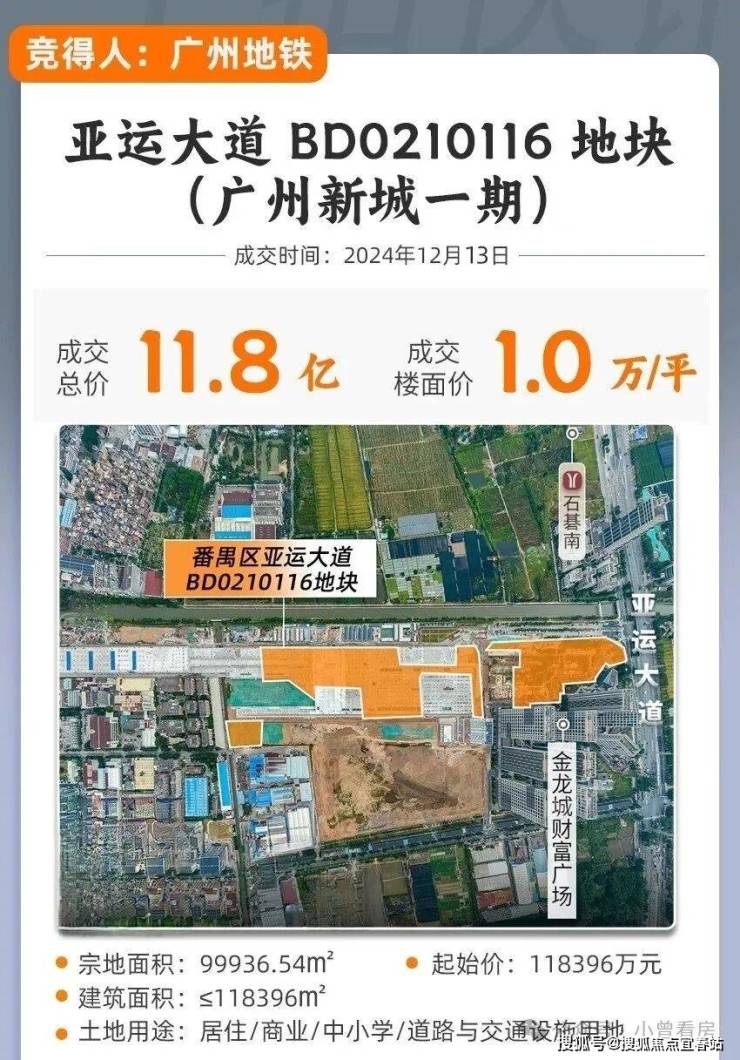 那么,大家还记得去年12月广州新城停车场一期地块(亚运大道BD0210116地块),被广州地铁地产以底价118396万拿下,折合单价1万一平。