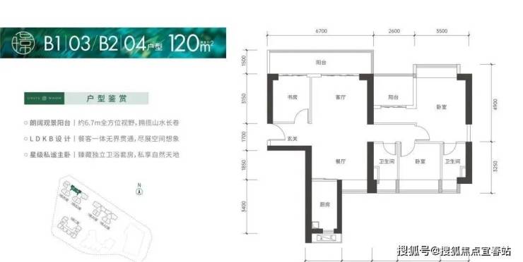 120㎡的4房2厅2卫,设计的是竖厅南北通透格局,客厅4.2米开间,进门入户玄关,LDKB一体化设计,4个卧室分别做到了3.5米/2.7米/2.6米/2.5米的宽度,客厅连接次卧出6.7米长的大阳台,L型厨房,卫生间干湿分离,得房率:75.66%(不含赠送),阳台主朝东北向。