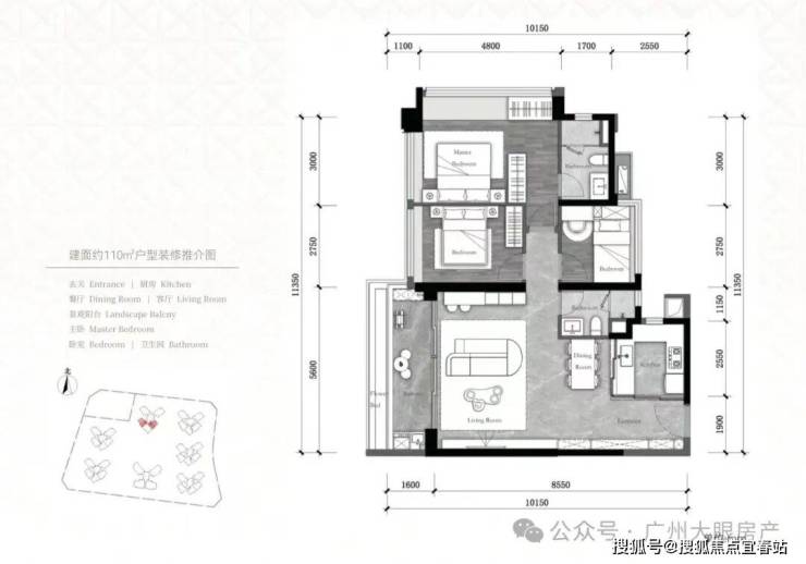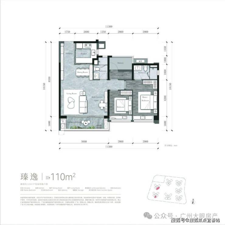建面约𝟏𝟏𝟎m²户型【可改四房】,全开间朝南 约𝟏𝟏.𝟑米南向采光面