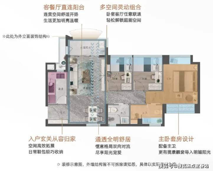 在起居动线上做到动静分区,竖厅设计,客厅直出阳台,餐厅带窗户,户型通透,确保良好的通风和采光。