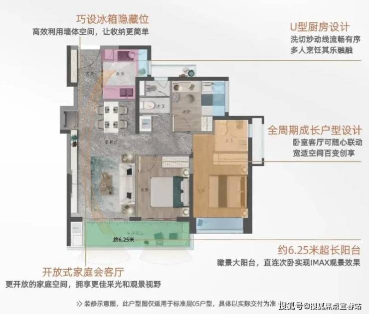 开间约6.25米(含墙体)巨幕阳台,使用空间阔绰,为全家人运动+娱乐提供了更大的空间。