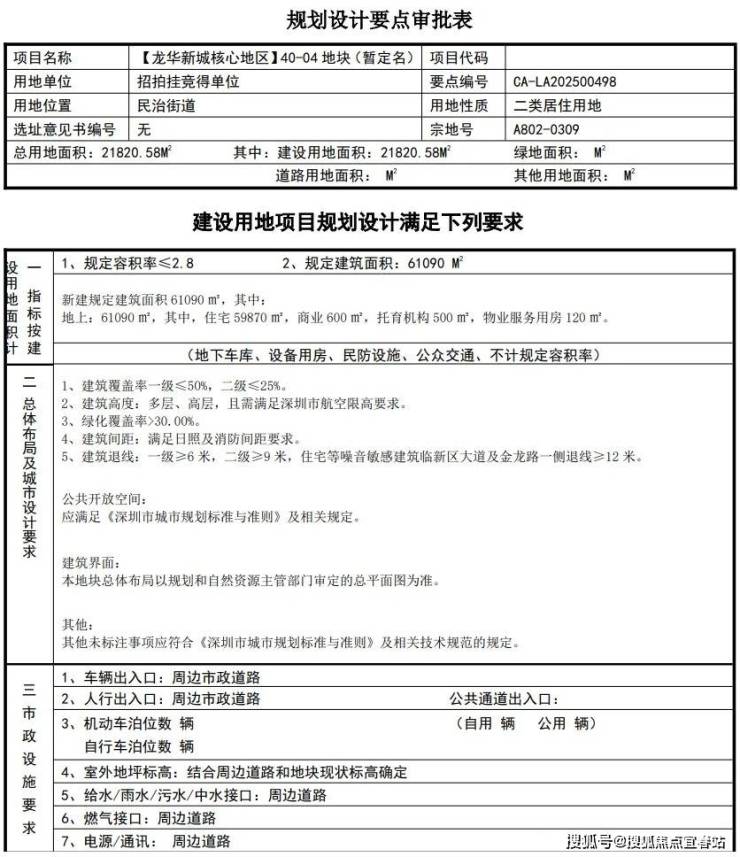 公告显示:该宗地位于龙华区民治街道金龙路和新区大道交汇处东侧,土地用途为二类居住用地,土地面积21820.58平方米,规定容积率≤2.8,规定建筑面积61090平方米,其中:地上:61090平方米,其中,住宅59870平方米,商业600平方米,托育机构500平方米,物业服务用房120平方米。