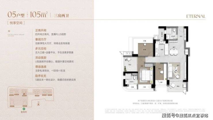105㎡产品是初改客户的最佳之选,类比在市场上同面积产品,卓越的105㎡产品做到了3+1的空间,同时还保证了开间尺度的舒适性,并且户型还是主体南向的南北通透,无论在空间、舒适度、通透性上都做到了最佳。