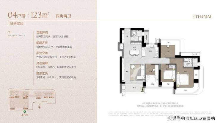 项目123㎡产品,实现了4房空间构造,同时还保证户型南北通透同时4个空间为南向开启,产品构造上通过凸窗延展了景观面,是市场上极少见的南向优质产品。