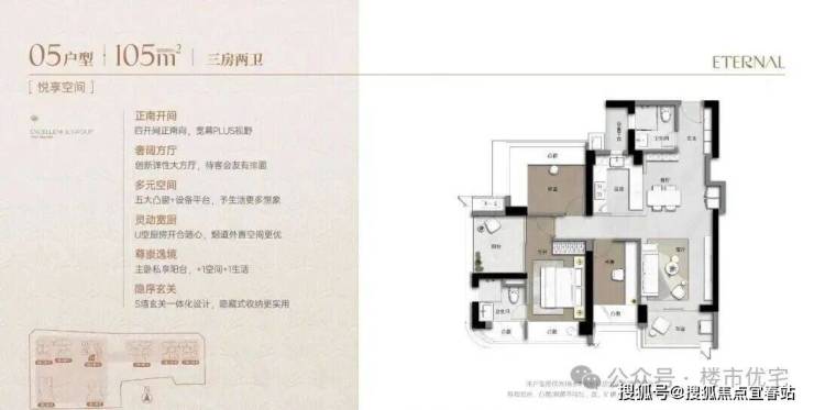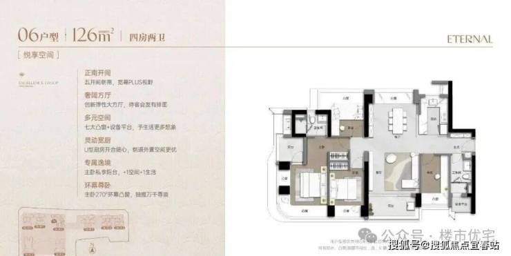 173m²的4房2厅3卫+家政间,设计的是竖厅类双龙抱珠格局,独立电梯厅入户约8.13㎡,客厅5.55米开间,LDKB一体化设计,主卧套房270°环幕凸窗+私享阳台,八大凸窗+设备平台+家政间,分别做到了主卧27.1㎡/次卧14.87㎡/次卧12.38㎡/次卧8.38㎡/家政间2.93㎡+阳台1.38㎡(实测面积,去掉墙体),U型厨房,公卫三段式干湿分离,得房率超90%(包含赠送),阳台9.56㎡正北朝向,看会展中心+市民广场。