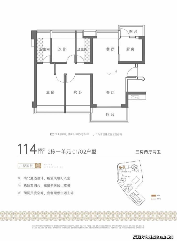 核心亮点:南北通透格局,部分户型配备双阳台,采光和通风较好。全系采用品牌精装标准,兼顾实用与格调。