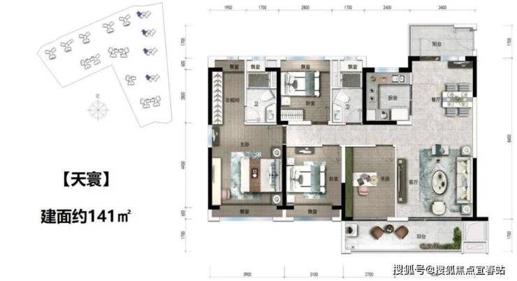天寰组团首推12栋,建面约85-141㎡的3-4房,大都朝南分布,采光通风俱佳,实用率优秀。