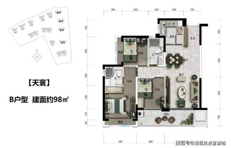 约98㎡的三房两卫,约5.7米阳台+主卧套房+U型明厨,空间感很足。