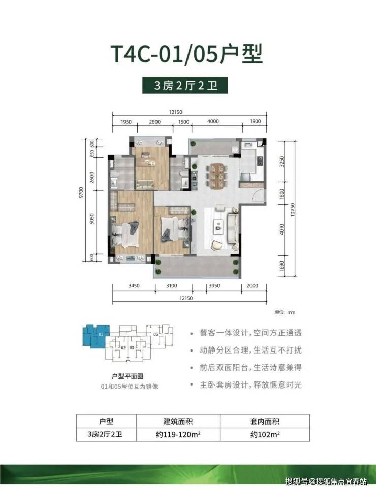 :3 房 2 厅 2 卫,建筑面积约 119 - 120m²,套内面积约 102m²。餐客一体,空间方正通透,动静分区合理。前后双面阳台,让生活充满诗意,主卧套房设计十分惬意。