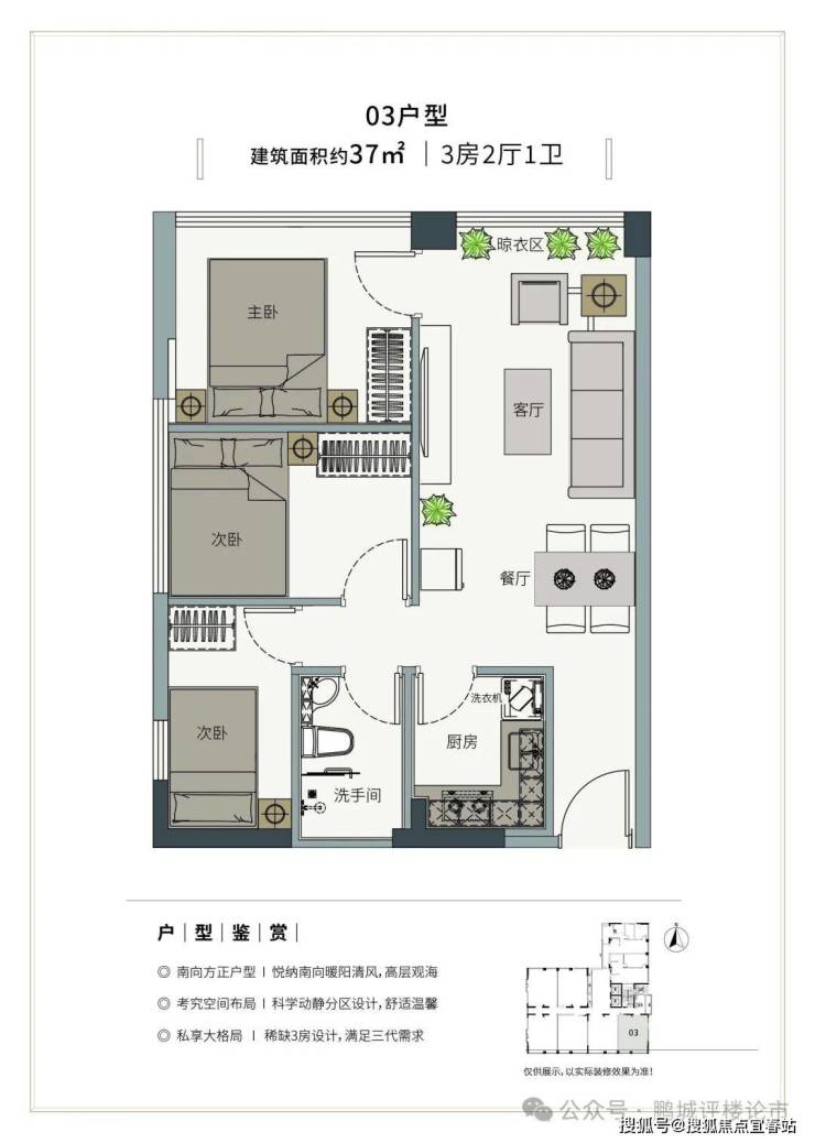 👑户型鉴赏01户型(3房2厅1卫)建筑面积约:37㎡,套内使用面积约:64㎡