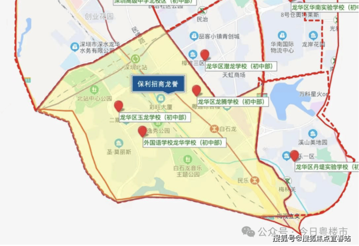 教育方面,项目距离深圳外国语学校(龙华学校)773米,步行11分钟,深国外是龙华排名前三的名校。周边还有玉龙学校(距离941米,步行约14分钟)、龙腾学校(新学校,距离847米,步行约11分钟)等教育资源。不过据悉,保利招商龙誉与深外龙华校区小学无缘,项目在新建的龙腾学校范围内,初中为龙腾学校、玉龙学校和深外龙华校区三所学校共享学区。(具体以教育局最新公布为准)