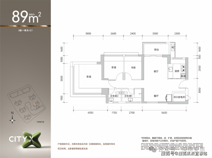 89㎡的3房2厅2卫,3栋1单元01/07户型,设计的是竖厅南北通透格局,客厅3.3米开间,LDKB一体化设计,四开间朝南,主卧270°无转角飘窗,3个卧室分别做到了主卧15.63㎡/次卧7.54㎡/次卧6.96㎡(包含墙体飘窗),U型厨房,卫生间干湿分离,得房率约90%(包含赠送),阳台主朝西北或东北向。