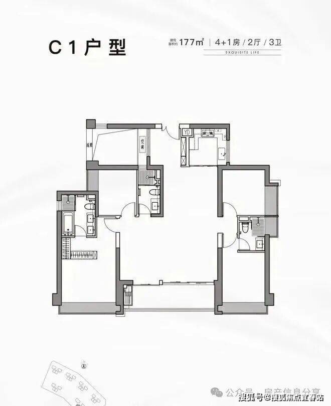 177平:5房2厅3卫,西南朝向,使用率77.43%(不包含赠送)