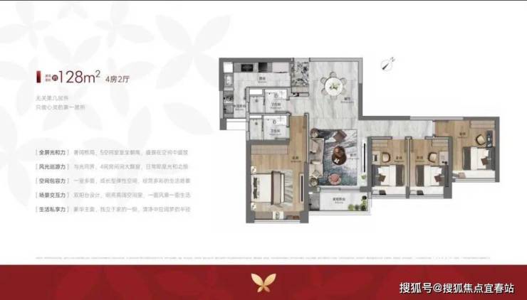 建面约128㎡的东南向望江大平层,以五开间朝南+16米采光面,让业主在不同生活场景下皆能享白鹅潭一线江景。