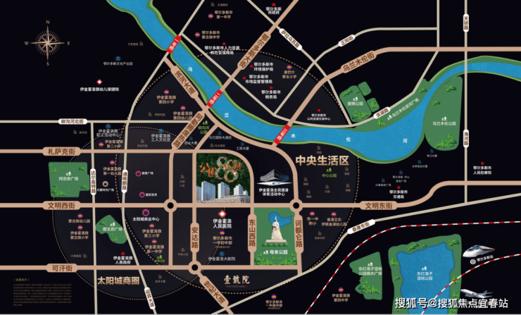 ●配套一流:向南与母亲公园为邻,向北近邻乌兰木伦河畔,踞守公园大境,推窗即享鲜氧;伊金霍洛旗购物中心、亿城商场、丽景广场、伊百购物、太阳城商业中心、国贸百货等成熟商业交汇,尽享一城繁华;