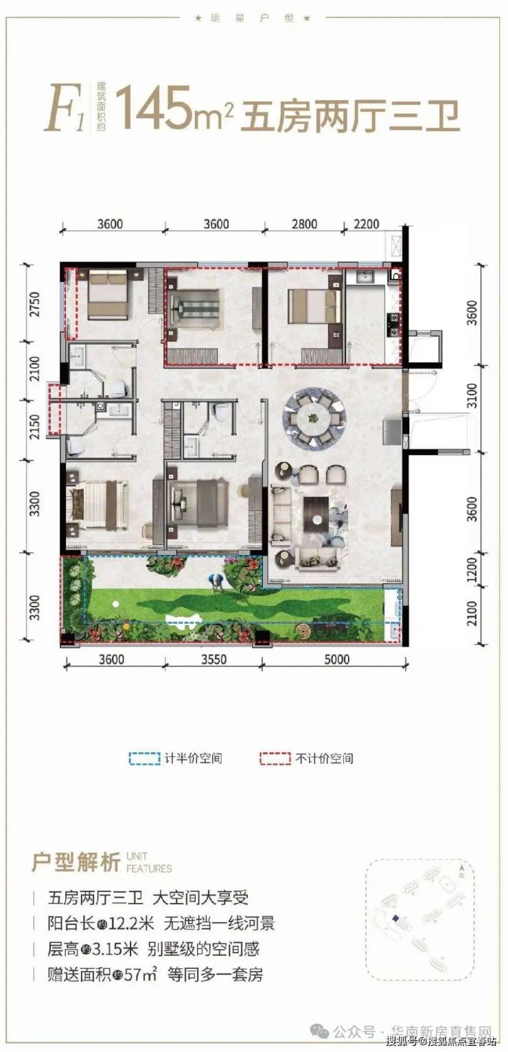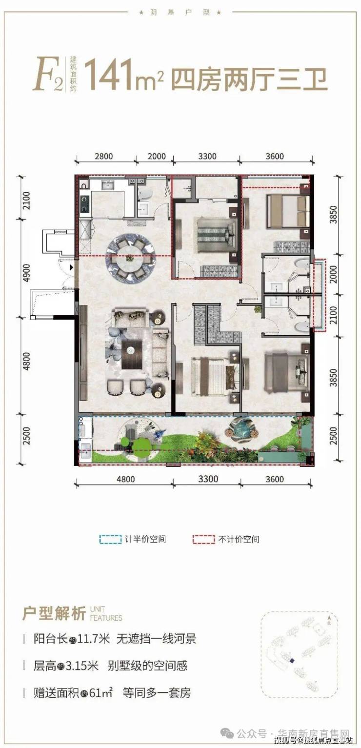 ②产权式酒店,户型南北通透,面积93-145㎡两房至四房。赠送超大面积,93㎡两房一卫、97㎡小三房两卫、115㎡三房两卫、141㎡四房三卫;阳台面宽高达12米,部分阳台可270°三面河景。