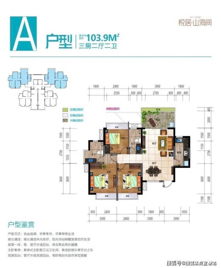 悦居·山海间在售户型面积约为101㎡~106㎡,包括三房两厅两卫和两房两厅一卫两种格局。户型方正,明厨明卫,动静分区合理,阔绰阳台设计,让居住空间更加宽敞明亮。其中,北朝向的三房两厅两卫户型全通透,采光极佳;南朝向的三房两厅两卫户型半通透,视野开阔。购房者可以根据自己的需求和喜好选择合适的户型。