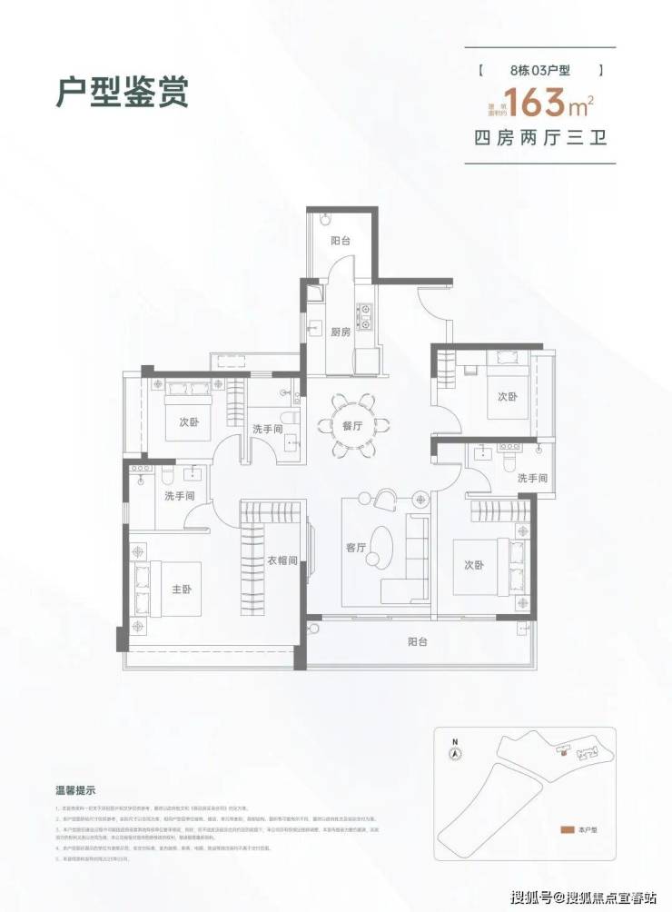 163㎡的4房2厅3卫,设计的是竖厅格局,一梯一户,进门入户玄关,LDKB一体化设计,三开间朝南,双主卧套房,客厅连接次卧出大阳台,L型厨房还带1个生活阳台,卫生间干湿分离,得房率约82%(不含赠送),东南朝向。