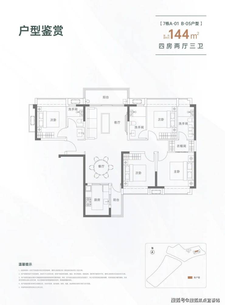 144㎡的4房2厅3卫,设计的是竖厅南北通透格局,进门入户玄关,LDKB一体化设计,双主卧套房,L型厨房还带1个生活阳台,公卫干湿分离,得房率约82%(不含赠送),阳台主朝西北向。