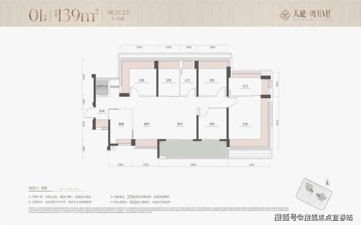 建面约139㎡正5房奢阔横厅户型一步到位,满足家庭生命全周期需求。约6.8m全画幅宽尺阳台+全屋采光+主卧套房270°超广角海景飘窗,带来沉浸式的海幕享受。