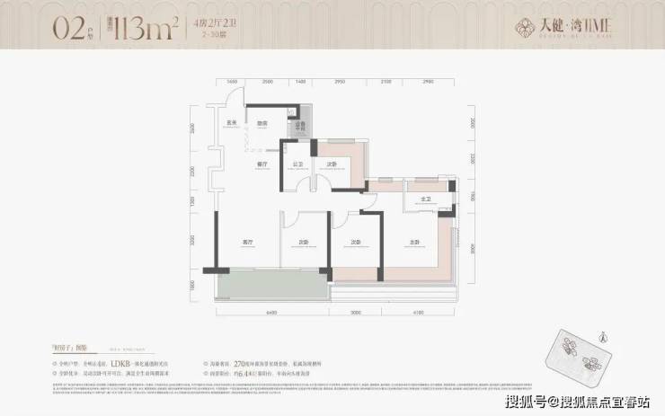 建面约113㎡正4房阳光户型LDKB一体化设计,灵动可开可合次卧设计满足家庭成长需求,约6.4m巨幕宽景阳台+270°环幕飘窗带来极目无界头排海景。