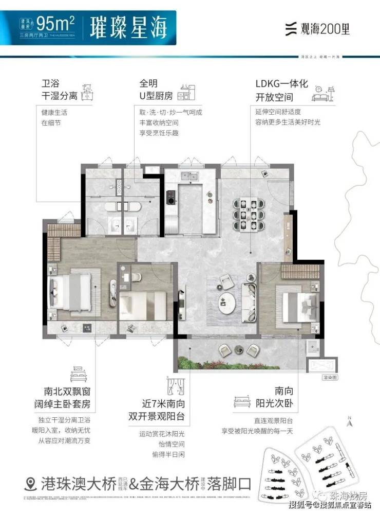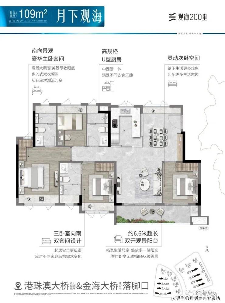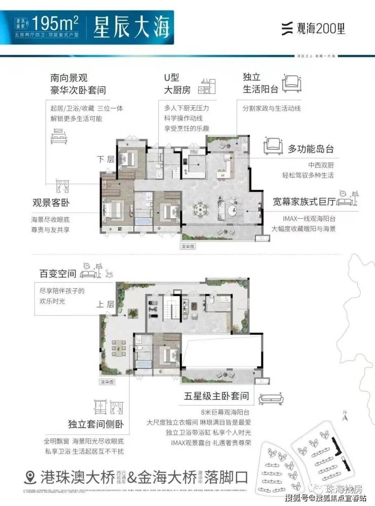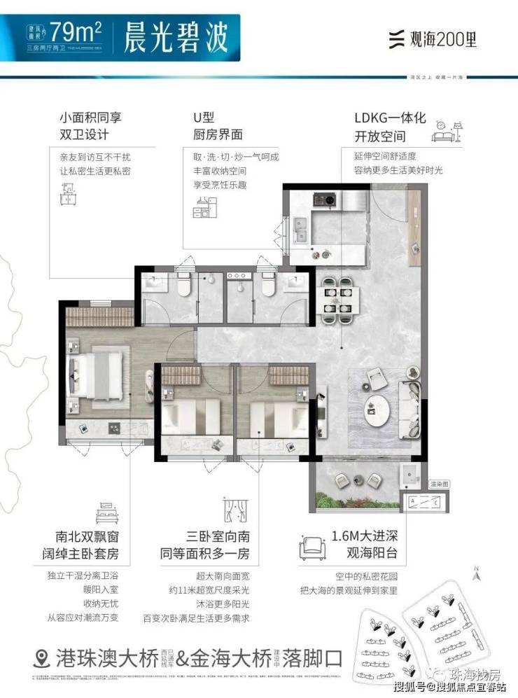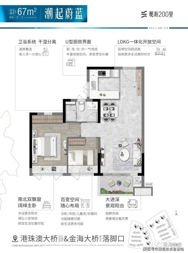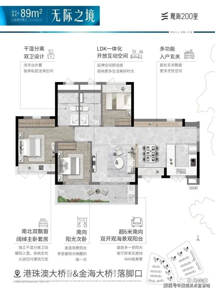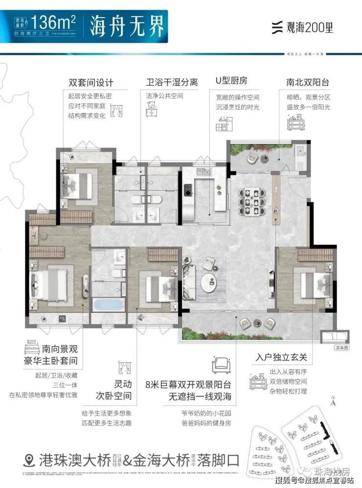 观海200里,择址全国最具发展潜力的城市群·粤港澳大湾区,在湾区九城中,独与香港、澳门路桥相连的珠海未来城市新中心——横琴西·滨海商务区,同时拥有路轨空三大立体交通网络,及拥有三面环海、天然海岸线、沙滩湿地等不可复制海岸资源的半岛地块,打造一线看海的海居3.0产品。