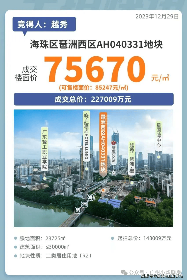 2023年最后一个工作日,琶洲西区AH040331地块被越秀地产广州区域摘得,折合楼面地价超7.5万/平,一度冲上全国地价TOP6。