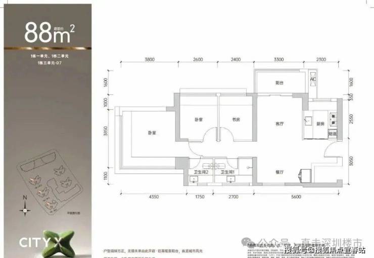 88㎡的3房2厅2卫,设计的是竖厅南北通透格局,客厅3.3米开间,LDKB一体化设计,四开间朝南,主卧270°无转角飘窗,3个卧室分别做到了主卧15.63㎡/次卧7.54㎡/次卧6.96㎡(包含墙体飘窗),U型厨房,卫生间干湿分离,得房率约74.6-75.4%(不含赠送),阳台主朝西北或东北向。套内面积66.45㎡+赠送面积11.58㎡=实得78.03㎡,加上赠送后得房率约87.56%。